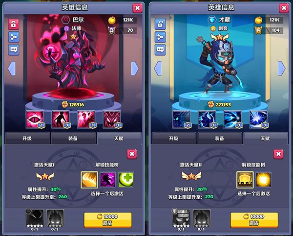 第四排比较特殊,战士加闪避,刺客加破防、游侠加命中、牧师加速度、法师加命中,上限50级数值不定。最后一排都是加技能伤害,上限40级为+40%。总的来说,这是提升一级所有人物吃香的系统,因此是所有玩家优先必点的玩法。但是初期金币较少,加上玩家们渴于新英雄,因此等到满星14级后来提升这块可谓是最重要的一环。