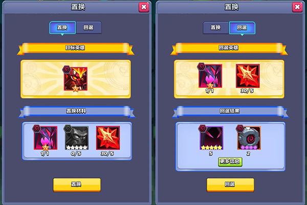 此外值得一提的是,10星以后的英雄将提供置换和回退两种功能。通过置换你可以将手中的10星英雄+5个目标英雄(五星)+5个凤凰石(活动获取),换成你想要的其他10星英雄(同阵营),避免玩家浪费大量时间和精力去培养。而回退则是将10星英雄解体,通过10星英雄+5个凤凰石可以分解为5个本体英雄(五星)+2个9星当前阵营英雄(随机),以及25M金币、30M紫魂、22K金魂、22K符文石和身上的装备。具体这个功能如何,玩家们一看便知。
