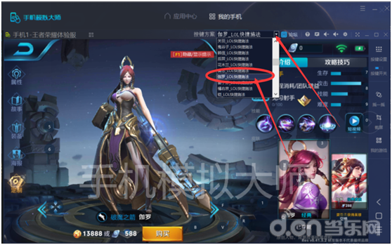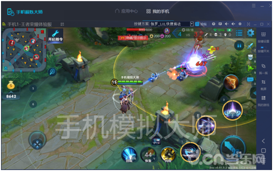 3.启动游戏之后,虚拟手机顶部可以选择对应英雄的按键方案。推荐右键对应英雄的LOL行走方式,鼠标右键按住,指到哪里往哪里走。比WASD方向操作灵活。施法键可以按下去不松开,鼠标指向哪里方向就对准哪里然后松开释放。按F1可以显示/隐藏按键方案,查看不熟悉的按键。还可以点击按键设置进行自定义修改。
