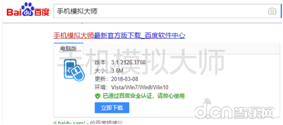 1.进搜索网站如百度搜索“手机模拟大师”。然后点击立即下载安装。或者搜“鲁大师”,进鲁大师官网点击“手机模拟大师”标签进入首页下载。