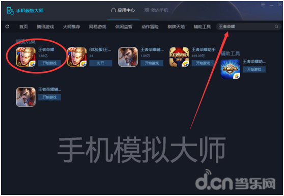 1.安装之后启动主程序。点击顶部“应用中心”,右侧有个搜索框,输入“王者荣耀”。搜索出来后点击“开始游戏”进行安装。