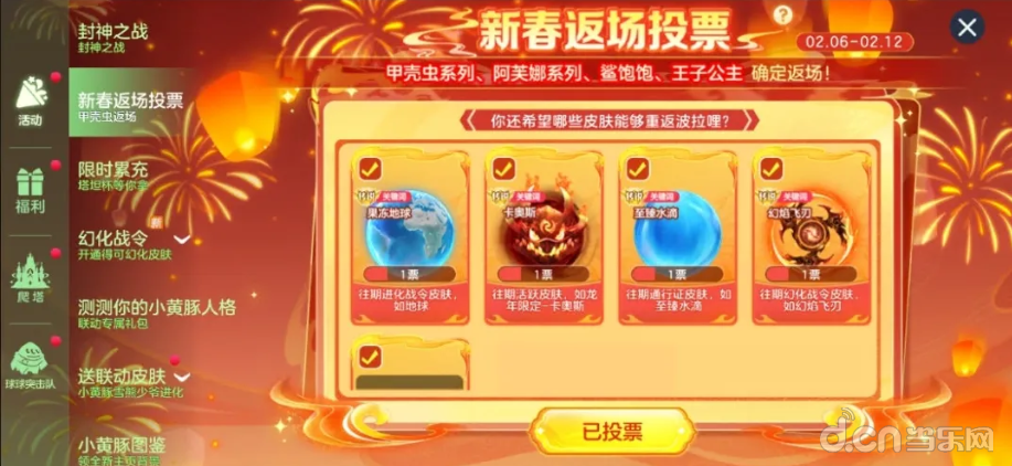 新春返场皮肤投票于2月6日至2月12日期间开启,球宝将自主决定返场皮肤!「鲨饱饱」、「甲壳虫」、「阿芙娜」已确认回归,更多皮肤由你票选。